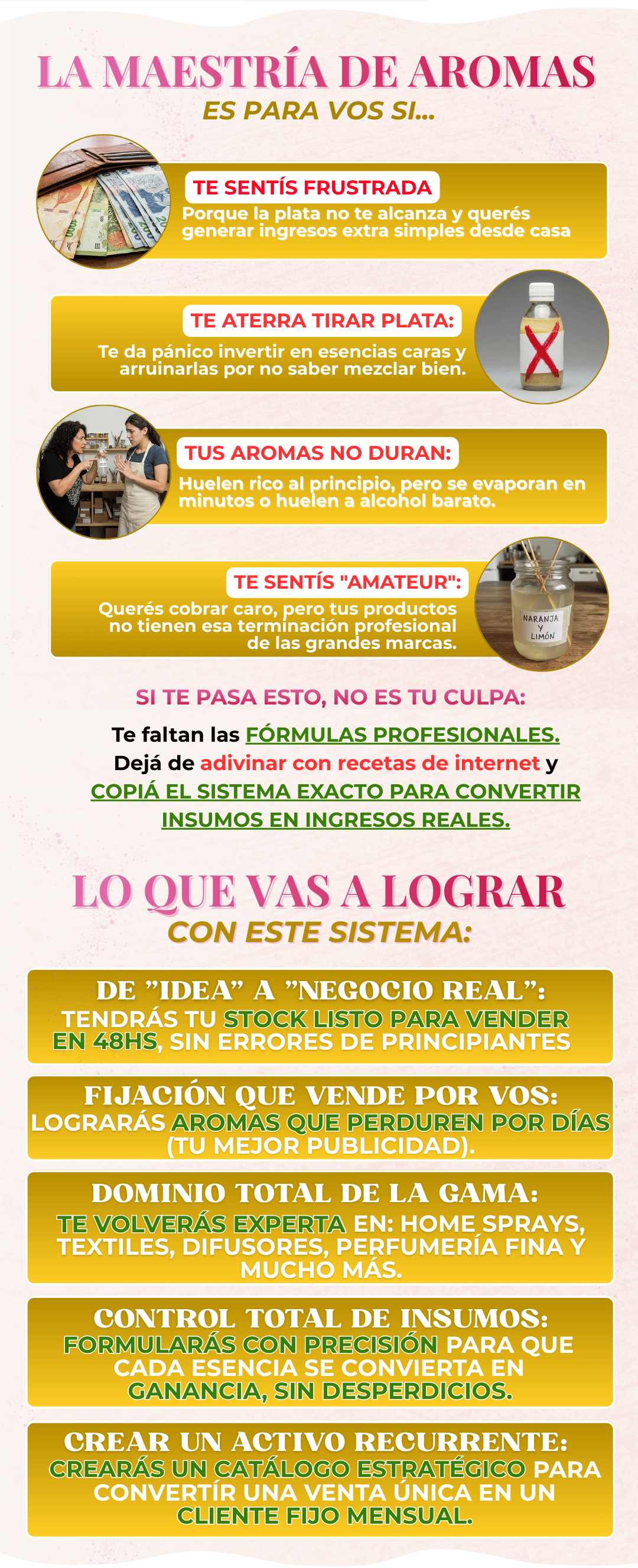 Nunca vas a estar sola. Tenés acceso directo a nuestro Soporte VIP por WhatsApp para hacernos consultas personales. También podés escribirnos a maestriaenaromas@gmail.com